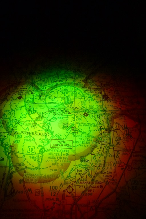 I’m pretty impressed with the red/green mix. It works extremely well for the medical side of the house and it also has exceptional map reading and navigation application. Take a look at the picture below. This is the Jacksonville sectional, which covers Tampa as well. This picture was taken in total darkness only illuminating the chart using the red/green combination in low power. I experienced no loss of night vision.