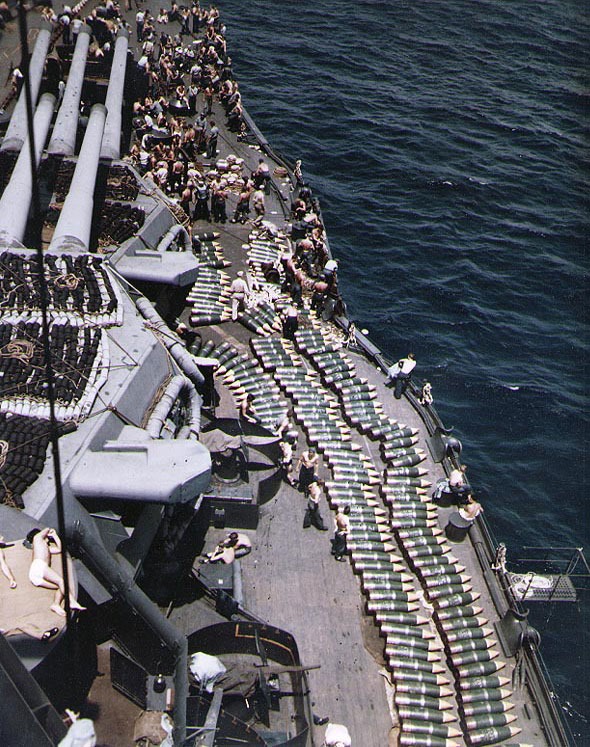 14 inch shells line the deck waiting to be sent down range!