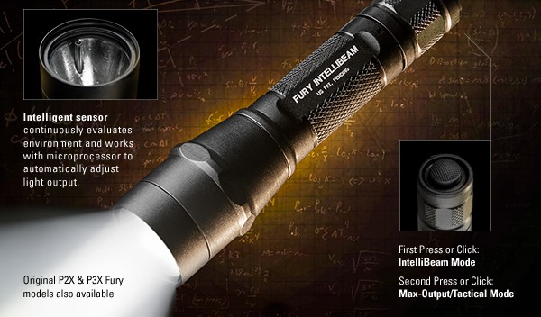 The P2X Fury features Surefire’s auto-adjusting IntelliBeam™ Technology. A first press or click activates its intelligent sensor and microprocessor-based system to continuously evaluate and seamlessly adjust light output based on your surroundings, so you always have the light output you need, and at the same time it also preserves dark-adapted vision by never activating on high in close quarters. For tactical light output, just press or click twice to lock 600 lumens of output. M.S.R.P. $229