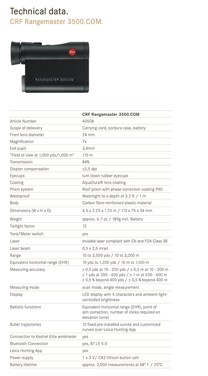 With the new Leica Rangemaster CRF 3500.COM, Leica Sport Optics (Wetzlar, Germany) presents a rangefinder with unparalleled performance up to 3,500 yards (3,200 meters). The Rangemaster CRF 3500.COM is also the first model to feature a powerful class 3R laser. In combination with the specially designed Leica Hunting App and integrated Bluetooth connection, the new Leica Rangemaster offers superior rangefinding and precision as well as intuitive operation.