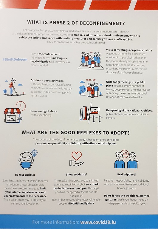 As small as it is, Luxembourg has not escaped the COVID 19 challenge but they have a pretty interesting way of keeping the public informed. Citizens receive pamphlets as represented in the image above. This is one in a series of 4 done in 5 languages; providing some fairly specific instructions as the country moves through the various phases of deconfinement.