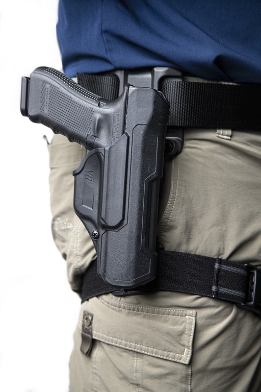 The new adapter enhances the Jacket Slot Belt Loop Holster Platform by adding the extra security of a single, high ride leg strap and eases movement with a swivel connected pivot point. Unlike a standard drop leg holster, the T-Series adapter enables the holster to remain in the upright position for an optimal draw stroke while also allowing users to extend their leg up or drop to a knee without having to worry about the holster remaining vertical. These actions are made possible by the swivel pivot point structured at the bottom of the Jacket Slot Belt Loop that connects to the leg strap versus the waistband.