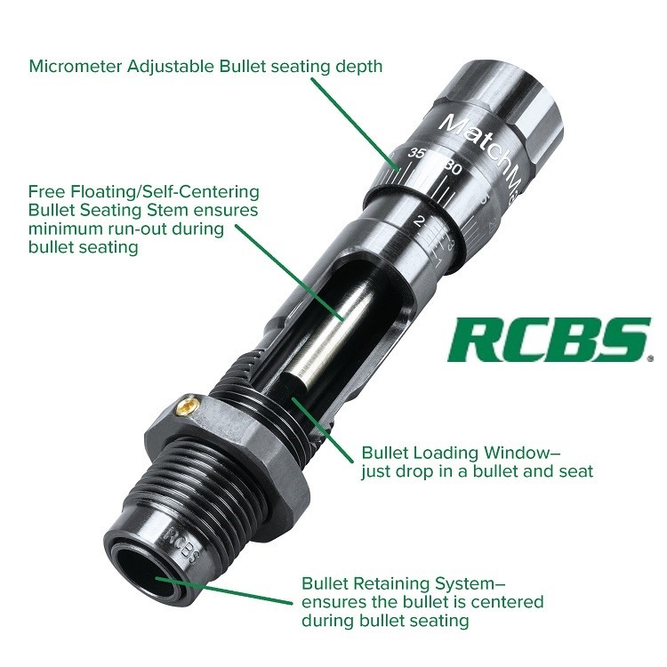 The Matchmaster Die Set includes two dies intended for precision reloading. It consists of a full-length sizer die with an expander-decapping unit and a seater die with bullet seater window. Some of the notable features on the Matchmaster Die set are a bullet loading window, micrometer adjustable seater, free-floating/self-centering bullet seating system found in the seating die plus a titanium carbo-nitride expander found in the sizing dies that reduces the force required when sizing with the expander button installed.