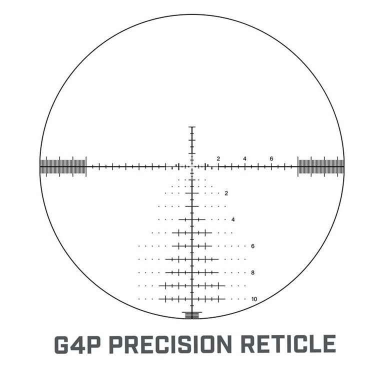 In addition, these scopes feature a new “G” series reticle designed in conjunction with G.A. Precision. Based on the G3 reticle, the new G4P design features a floating dot center POA, floating holdover dots, refined line widths, quick acquisition bars for low magnification settings, and a more open reticle space above the horizontal stadia.