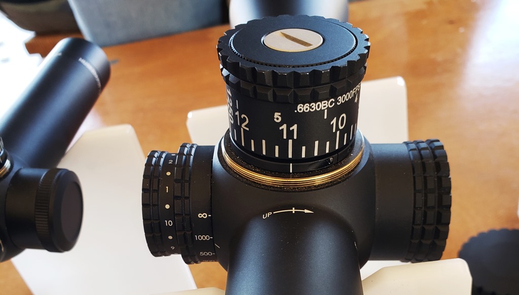 The turret is marked with b.c. specifics as well as muzzle velocity. The lower large of numbers is range to the target, and the smaller upper numbers are wind hold, which apparently tracks to the horizontal reticle stadia. It’s clearly a different and novel approach to customizing the optic for your rifle and ammunition combination.