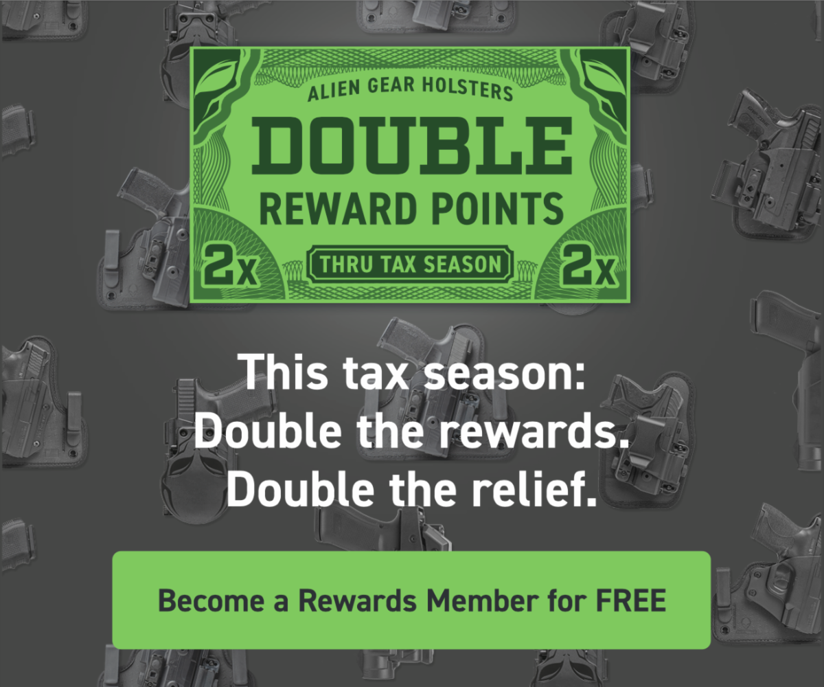 Post Falls, Idaho (February 2023) – Alien Gear Holsters®, designers and manufacturers of American-made holsters and firearms accessories, and the Rapid Force™ line of Level 2 and Level 3 Duty Holsters, feel your pain during this tax season and are offering double Alien Gear Holsters Loyalty Rewards Points on all purchases for a limited time during the 2022 tax season.