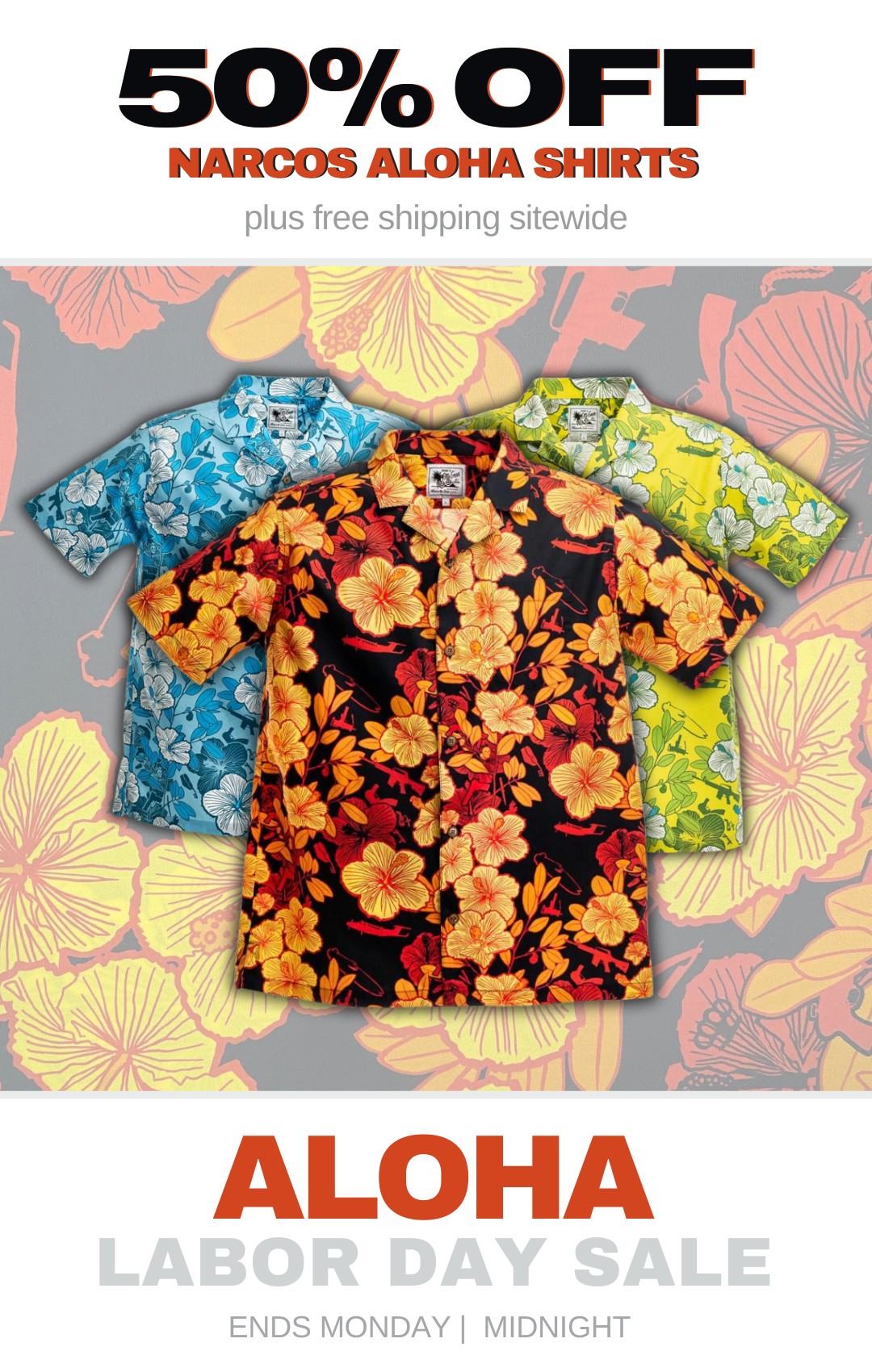 Labor Day Sale 50% off Narcos Aloha Shirts and Site Wide Free Shipping!
