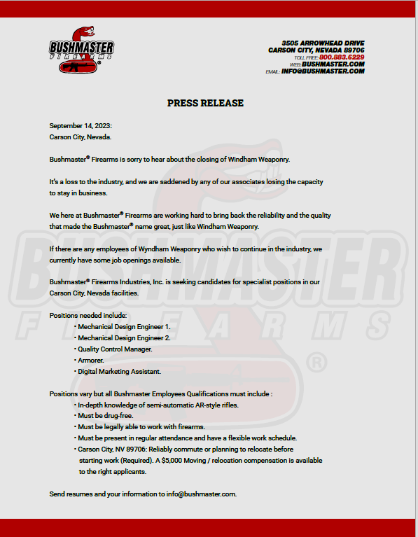 Employment Opportunities at Bushmaster for Wyndham Weaponry Employees.