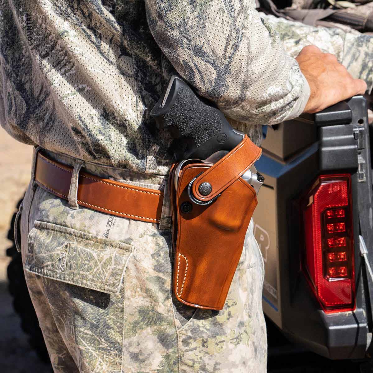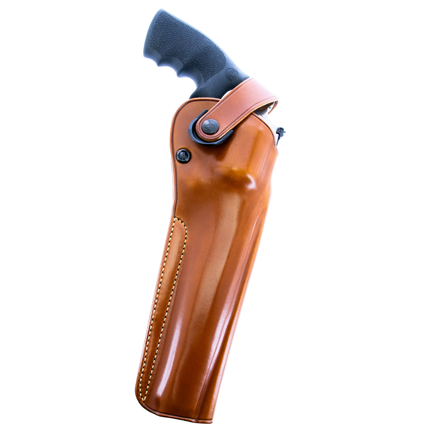 The DAO™ can be worn strong side or crossdraw at the user’s discretion. The holster employs a retention strap for simplicity and security in the brush. The retention strap has a large polymer tab to aid in snapping and unsnapping with a gloved hand. Tension screw adjustments allow for a custom fit to your revolver.