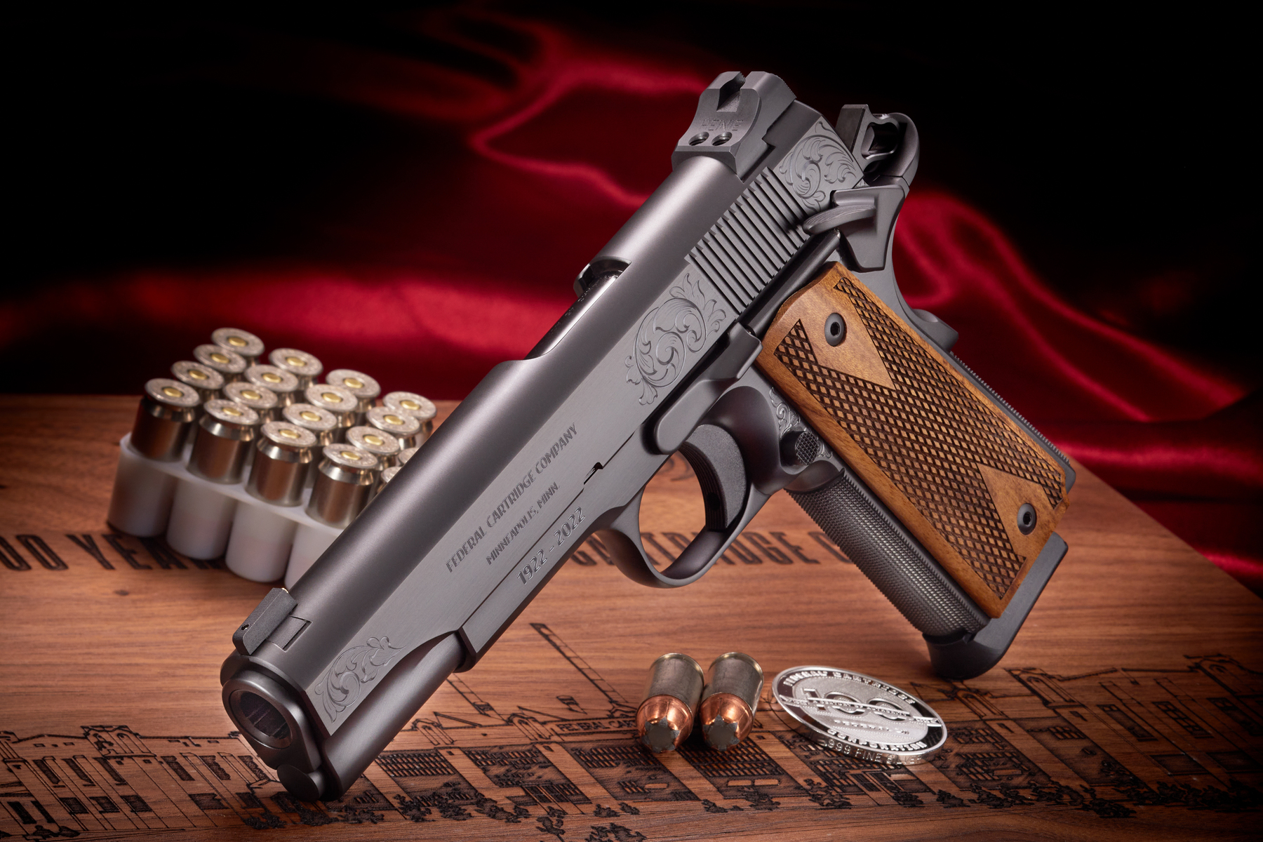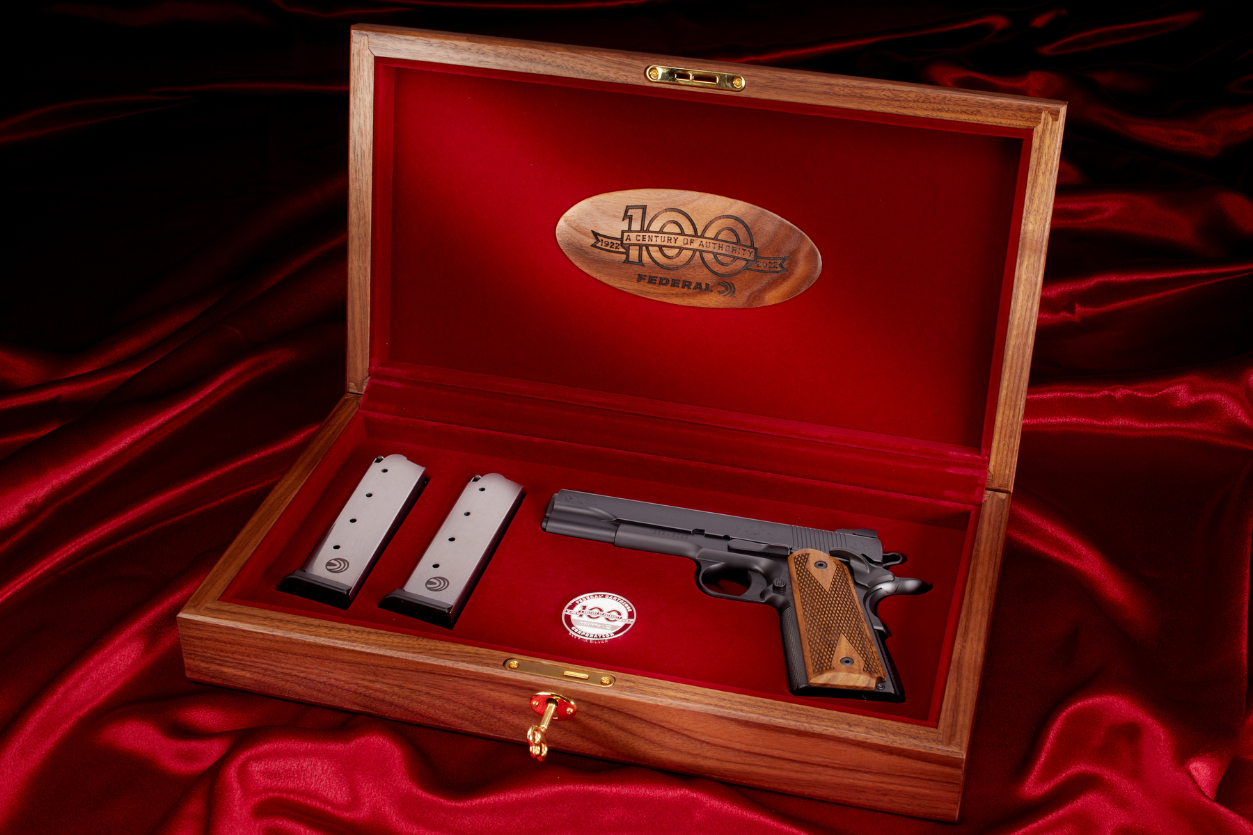 The package includes the Limited Edition 1911 pistol, custom walnut display box, the Federal 100th anniversary challenge coin, and two custom Federal laser engraved magazines.