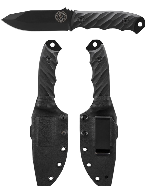 The Disaster Jr by Half Face Blades is custom-made for the SIG Reserve Collection and only available in limited quantities. This 8-1/8” fixed knife features a 3-3/4” elite black Cerakoted drop-point blade. The knife also features a contoured black G-10 handle, black Allen bolts for a sleek finish, and is crafted from American Crucible Steel CPM3V with an HRC rating of 59/60. Additionally, this knife comes ready with a suede-lined black Kydex sheath with a versatile metal belt clip that can be positioned on either side for both left and right-side carry.