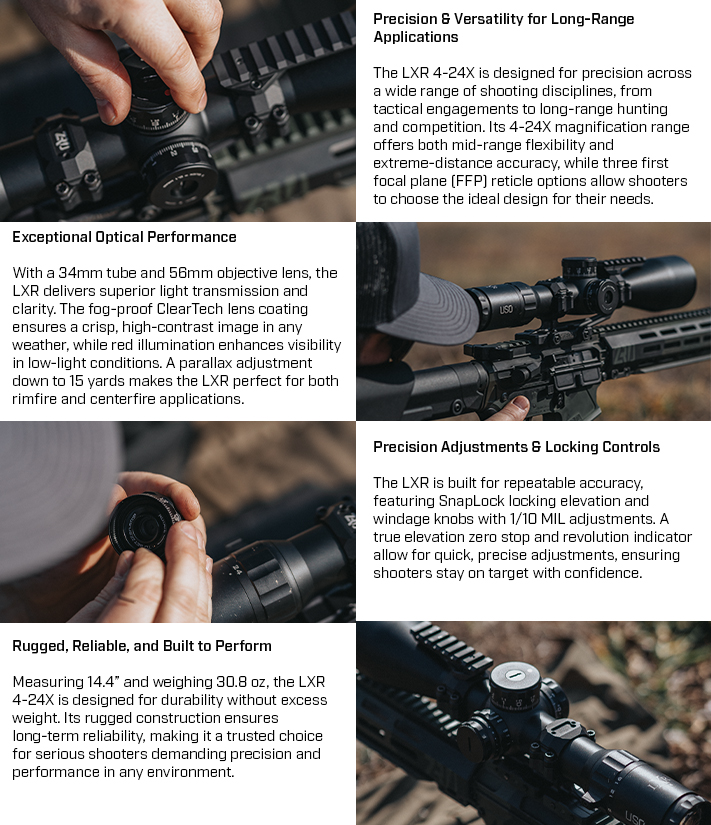 Introducing the LXR 4-24X Riflescope, built for long-range precision in tactical shooting and competition. With a 4-24X magnification range, multiple first focal plane (FFP) reticle options, and a 34mm tube with a 56mm objective lens, it delivers exceptional clarity, accuracy, and performance. Featuring SnapLock locking turrets, a true zero stop, and red illumination, the LXR is designed for repeatable accuracy in any environment.