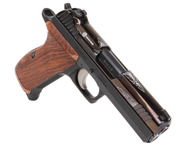 The P210 Carry Custom Works edition now features a custom high polished slide with contrasting engraved scrollwork, checkered Caribbean Rosewood grips, E-nickel coated trigger, and Siglite night sights, all specially selected to ensure that the P210 Carry Custom Works shoots as good as it looks.