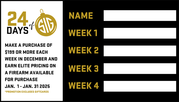 Did you participate in our qualifying purchase program during 24 Days of SIG? If you spent $200 or more each week during the month of December and had your card filled out by the SEC sales staff, you may be eligible for Elite pricing on a firearm. Head to the SIG Experience Center before February 1st to claim!